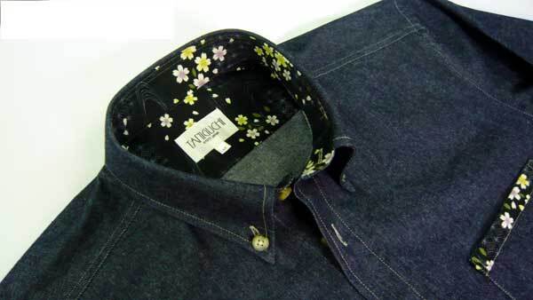 襟、カフス裏、下袖剣、ポケット口に黒い桜の別生地使用 ベージュでステッチをしています。